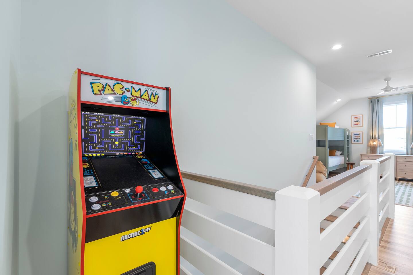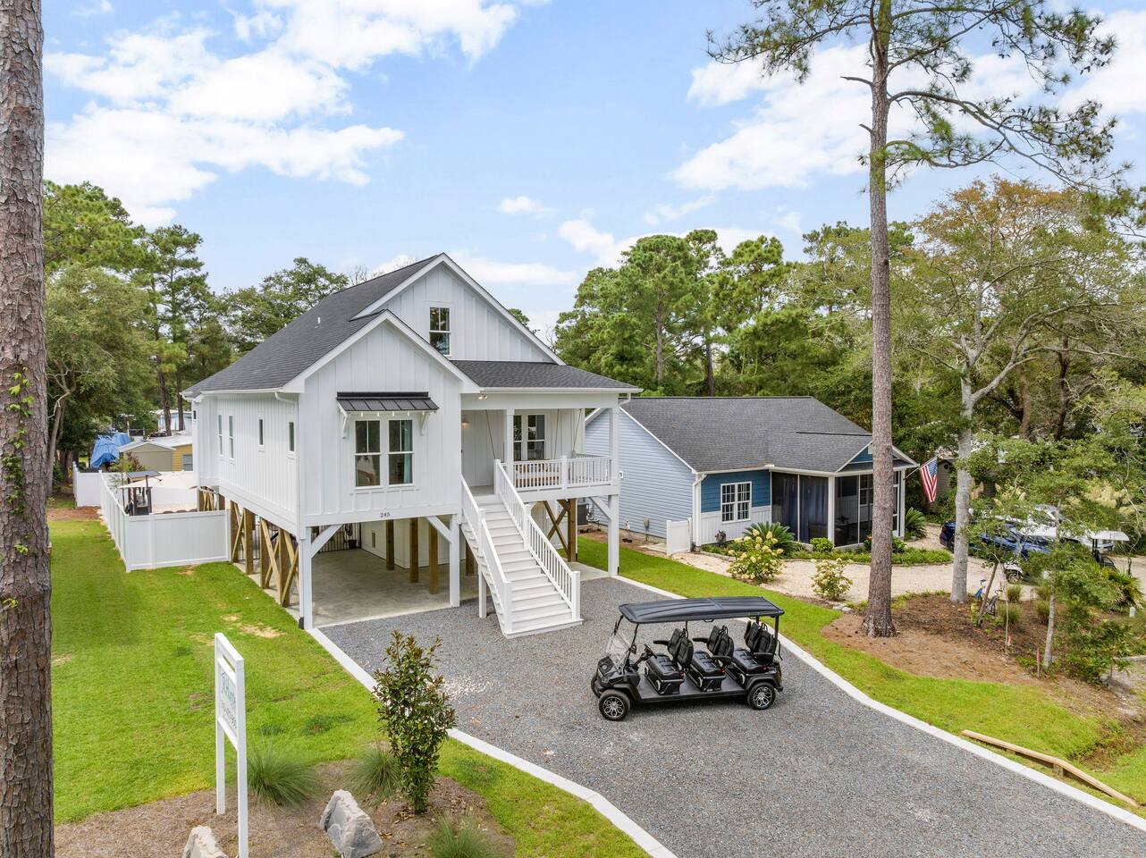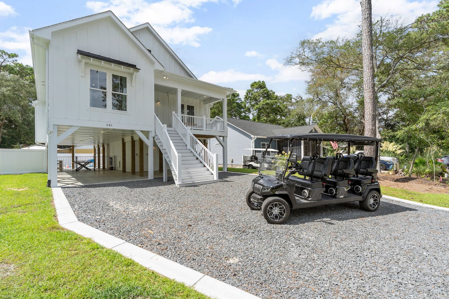 There is an elevator that can take you to the main floor where 3 bedrooms reside. The bunkroom is up 1 flight of stairs. There is parking for up to 6 cars. The keys for the golf cart are in a lockbox in the garage. If you purchase golf cart for your stay it is $75/day and you must book the entirety of your stay. Payment will be collected through the platform and a liability waiver will need to be signed prior to getting access to the lockbox code. If you lose a golf cart key, you will be charged $200 to pay for the cost of the replacement.