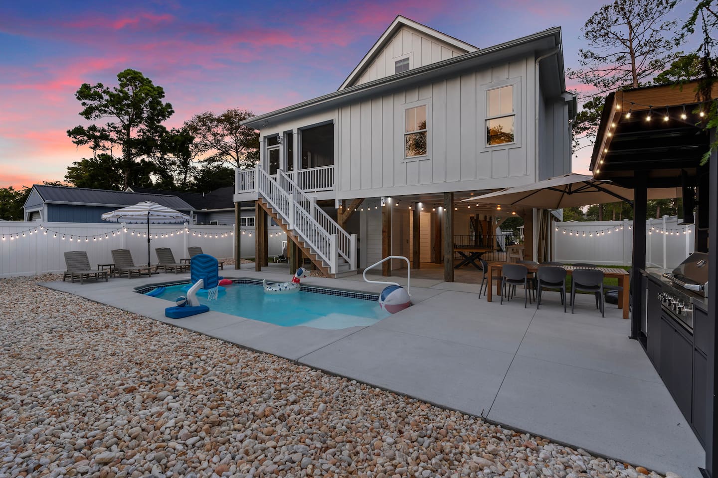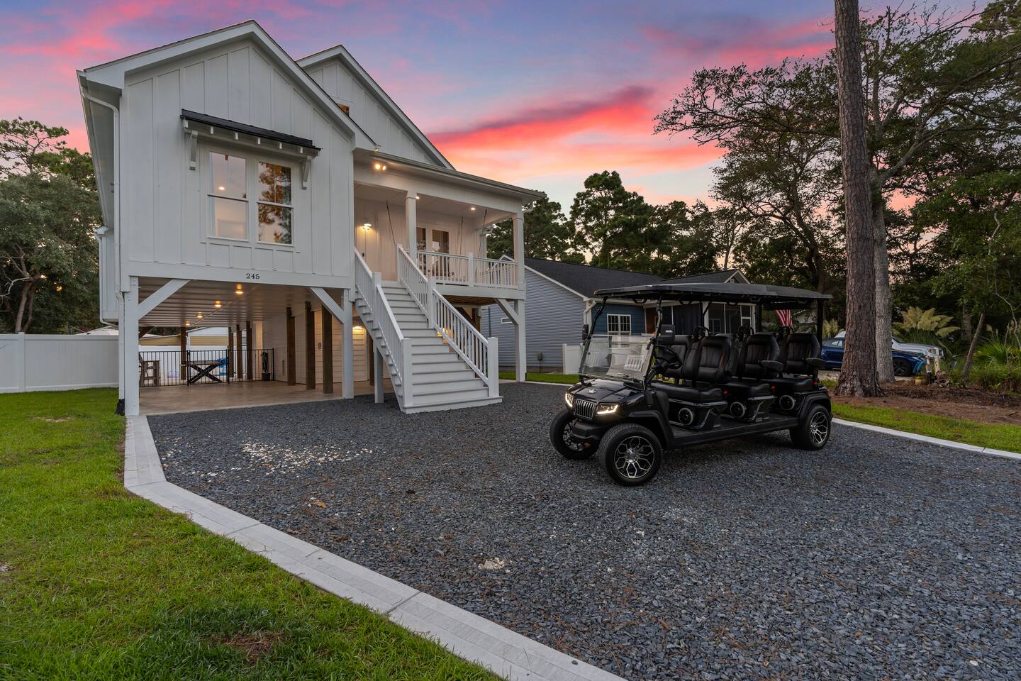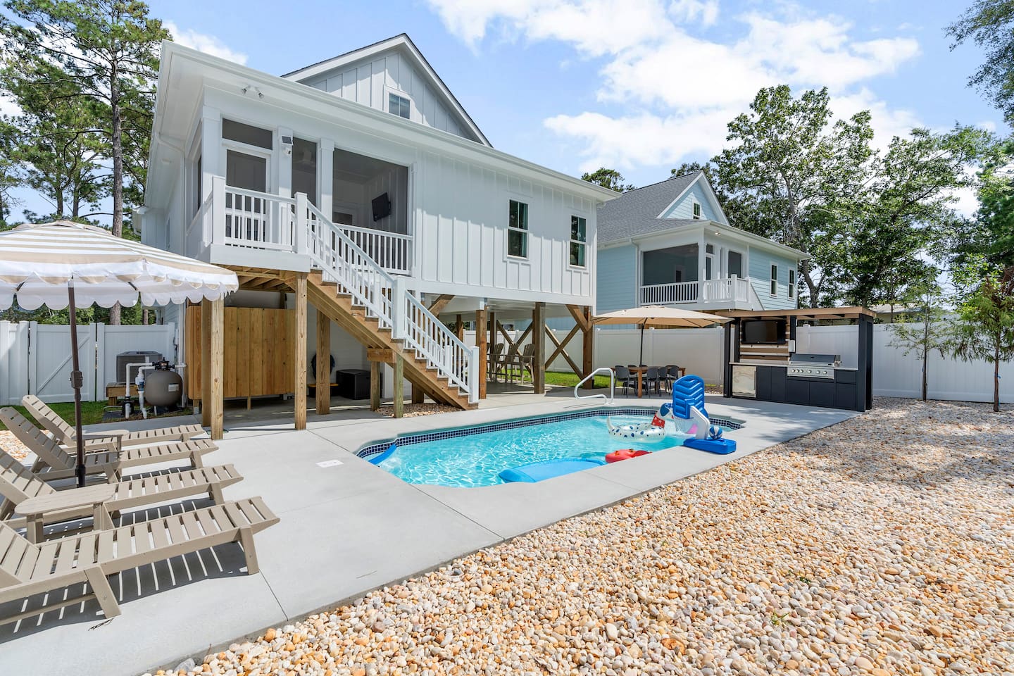 🌊 Where Family Magic Meets Modern Coastal Ease Imagine arriving at your private Oak Island retreat, tucked away on a quiet street yet just minutes from everything the island has to offer. The kids dash excitedly toward the bunk room, the golf cart waits in the garage, and you can already picture family dinners under glowing string lights by the pool. Not to mention the elevator you can load up your bags and take up to the main floor! This isn’t just another beach trip—it’s where lifelong memories are waiting to be made. 🛏 Sleep & Comfort for Everyone Hosting up to 12 guests with room to truly spread out: 1 king and 2 queen bedrooms designed as serene escapes for parents or couples. 1 bunk room with 3 sets of bunks, perfect for cousins, siblings, and late-night giggles. Every room is crafted with comfort in mind so everyone—from toddlers to grandparents—can wake up refreshed and ready for the beach. 🎮 Gather, Play & Reconnect Inside, the modern coastal design feels fresh, airy, and family-friendly. Curl up in the spacious living room for movie nights, or let the kids battle it out on the classic Pac-Man arcade game. With open layouts and thoughtful touches, this home makes together-time easy and effortless. 🌴 Backyard Oasis Under the Lights Step outside to your own private resort-style setting: Brand-new swimming pool with pool toys for hours of fun. Fully equipped outdoor kitchen for breezy family cookouts. Ping pong table for laughter-filled competitions. Dreamy string lights overhead, transforming every evening into something magical. Whether it’s cannonballs at noon or cocktails by the glow of the lights, this is where your family will spend the moments they’ll talk about for years. 🚲 Location: Quiet & Convenient This home is set on a peaceful street, yet perfectly positioned for adventure: 3-minute golf cart ride to the 70th Street beach access, with plenty of parking if you prefer to drive. Just minutes from Oak Island favorites—grab coffee at Island Jo Coffee-n-Cafe, enjoy fresh seafood at Swain’s Seafood, or end the night with ice cream at Lil & John’s. Quick access to Oak Island Pier, mini golf, and waterfront dining—family fun at every turn. 👶 Family-Friendly Touches You’ll Love We’ve stocked the home with kid-friendly amenities so parents can actually relax: High chair, crib, laundry room, safety features, and all the small comforts that make traveling with children smooth and stress-free. 🛺 Special Perk: Golf Cart Fun Turn every outing into an adventure with our brand-new 6-seater golf cart. Complete with Bluetooth speakers and plenty of storage, it’s the easiest (and most fun!) way to get around the island. Available for just $75/day. Stored safely in the garage, with quick waiver signing for access. ⏳ Book Now for Pre-Launch Pricing Right now, we’re offering special pre-launch pricing—but only for a limited time. Once word gets out, these dates will disappear quickly. 💙 Your Oak Island Story Awaits Picture it: sunset swims, family ping pong tournaments, golf cart beach runs, and kids falling asleep with sandy toes and full hearts. This home was designed for moments like these—moments you’ll never forget. Don’t wait—book your stay now and make your Oak Island getaway a story worth telling.