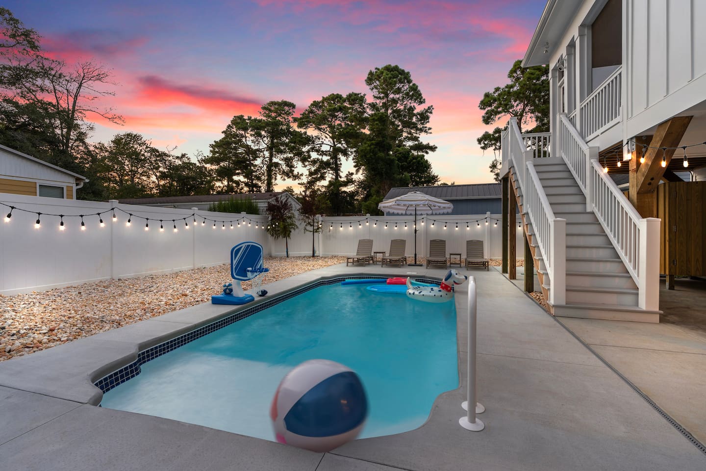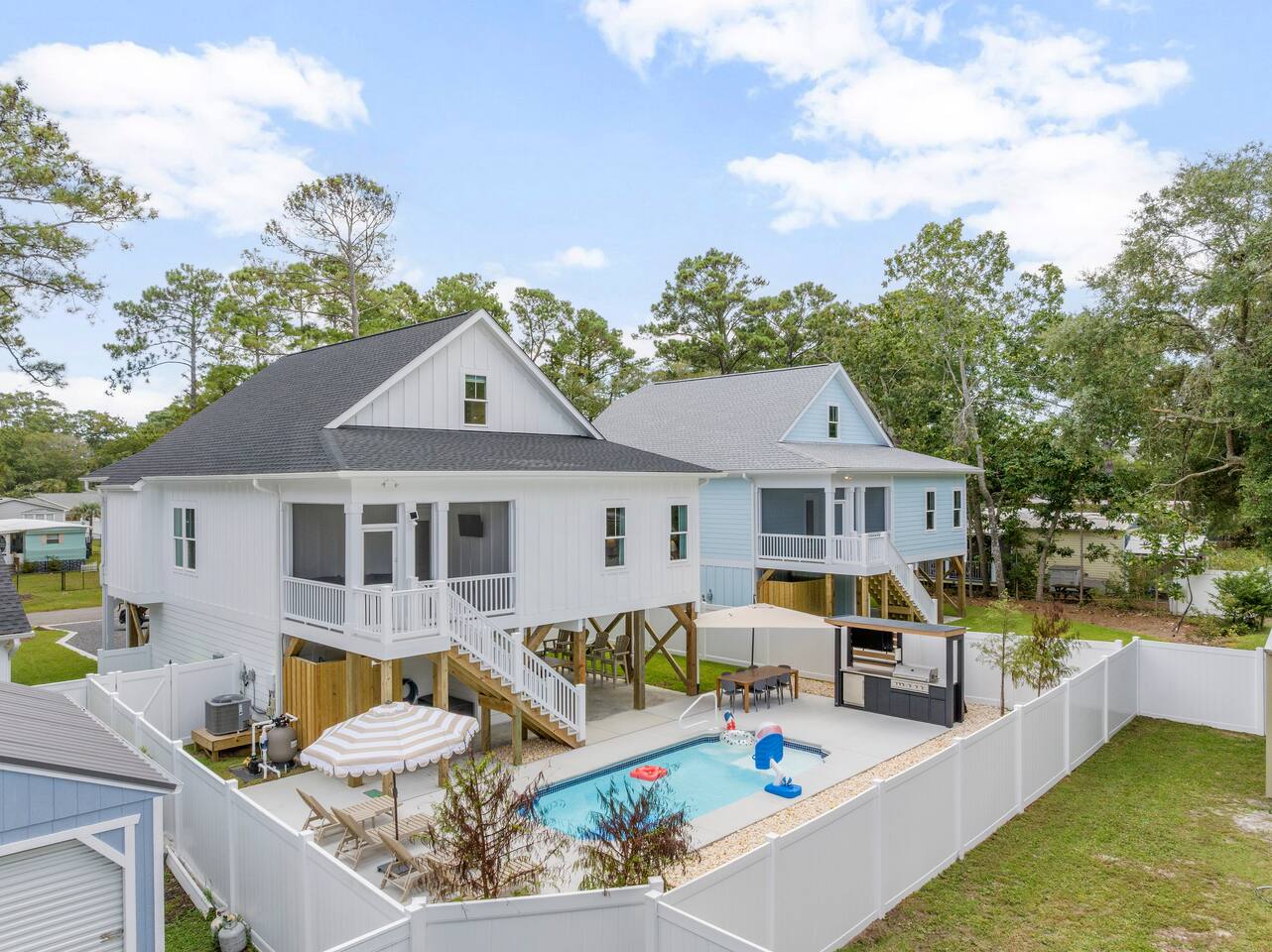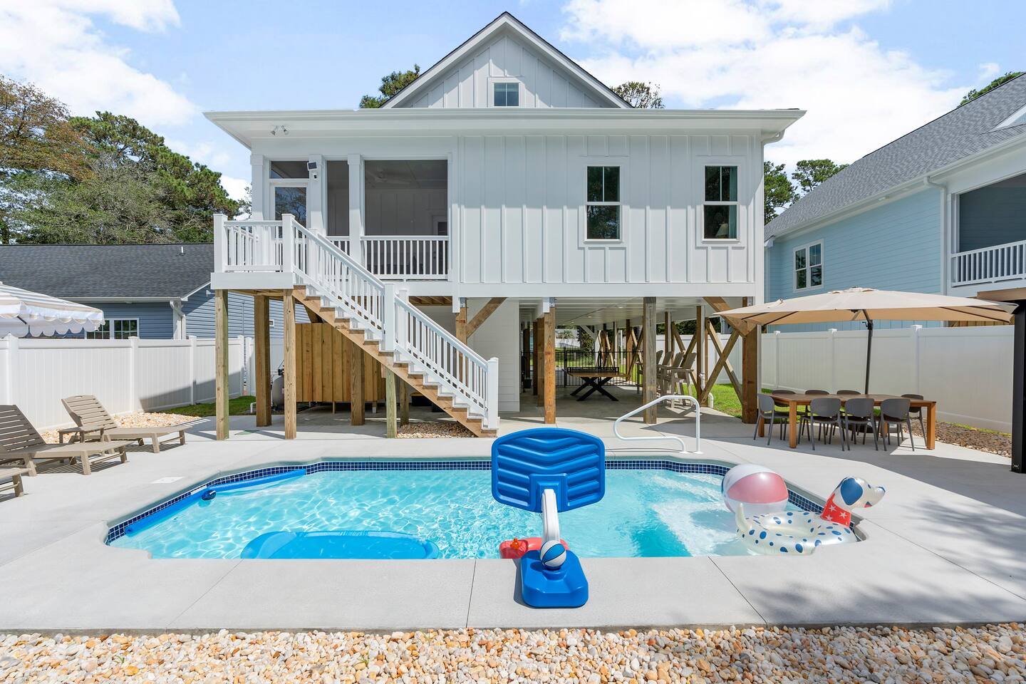 🌊 Where Family Magic Meets Modern Coastal Ease Imagine arriving at your private Oak Island retreat, tucked away on a quiet street yet just minutes from everything the island has to offer. The kids dash excitedly toward the bunk room, the golf cart waits in the garage, and you can already picture family dinners under glowing string lights by the pool. Not to mention the elevator you can load up your bags and take up to the main floor! This isn’t just another beach trip—it’s where lifelong memories are waiting to be made. 🛏 Sleep & Comfort for Everyone Hosting up to 12 guests with room to truly spread out: 1 king and 2 queen bedrooms designed as serene escapes for parents or couples. 1 bunk room with 3 sets of bunks, perfect for cousins, siblings, and late-night giggles. Every room is crafted with comfort in mind so everyone—from toddlers to grandparents—can wake up refreshed and ready for the beach. 🎮 Gather, Play & Reconnect Inside, the modern coastal design feels fresh, airy, and family-friendly. Curl up in the spacious living room for movie nights, or let the kids battle it out on the classic Pac-Man arcade game. With open layouts and thoughtful touches, this home makes together-time easy and effortless. 🌴 Backyard Oasis Under the Lights Step outside to your own private resort-style setting: Brand-new swimming pool with pool toys for hours of fun. Fully equipped outdoor kitchen for breezy family cookouts. Ping pong table for laughter-filled competitions. Dreamy string lights overhead, transforming every evening into something magical. Whether it’s cannonballs at noon or cocktails by the glow of the lights, this is where your family will spend the moments they’ll talk about for years. 🚲 Location: Quiet & Convenient This home is set on a peaceful street, yet perfectly positioned for adventure: 3-minute golf cart ride to the 70th Street beach access, with plenty of parking if you prefer to drive. Just minutes from Oak Island favorites—grab coffee at Island Jo Coffee-n-Cafe, enjoy fresh seafood at Swain’s Seafood, or end the night with ice cream at Lil & John’s. Quick access to Oak Island Pier, mini golf, and waterfront dining—family fun at every turn. 👶 Family-Friendly Touches You’ll Love We’ve stocked the home with kid-friendly amenities so parents can actually relax: High chair, crib, laundry room, safety features, and all the small comforts that make traveling with children smooth and stress-free. 🛺 Special Perk: Golf Cart Fun Turn every outing into an adventure with our brand-new 6-seater golf cart. Complete with Bluetooth speakers and plenty of storage, it’s the easiest (and most fun!) way to get around the island. Available for just $75/day. Stored safely in the garage, with quick waiver signing for access. ⏳ Book Now for Pre-Launch Pricing Right now, we’re offering special pre-launch pricing—but only for a limited time. Once word gets out, these dates will disappear quickly. 💙 Your Oak Island Story Awaits Picture it: sunset swims, family ping pong tournaments, golf cart beach runs, and kids falling asleep with sandy toes and full hearts. This home was designed for moments like these—moments you’ll never forget. Don’t wait—book your stay now and make your Oak Island getaway a story worth telling.